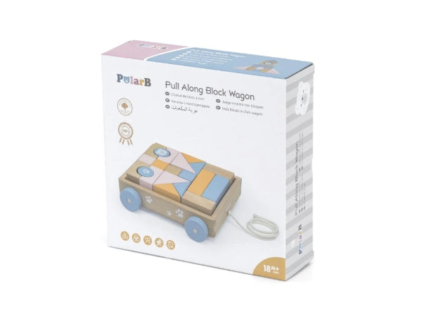 عربة خشبية حوالي 21 × 7 × 22 سم في الحجم ، مع عجلات وسلسلة سحب. يمكن استخدامه لحمل كتل خشبية من الأشكال المختلفة - المدرجة في المجموعة.