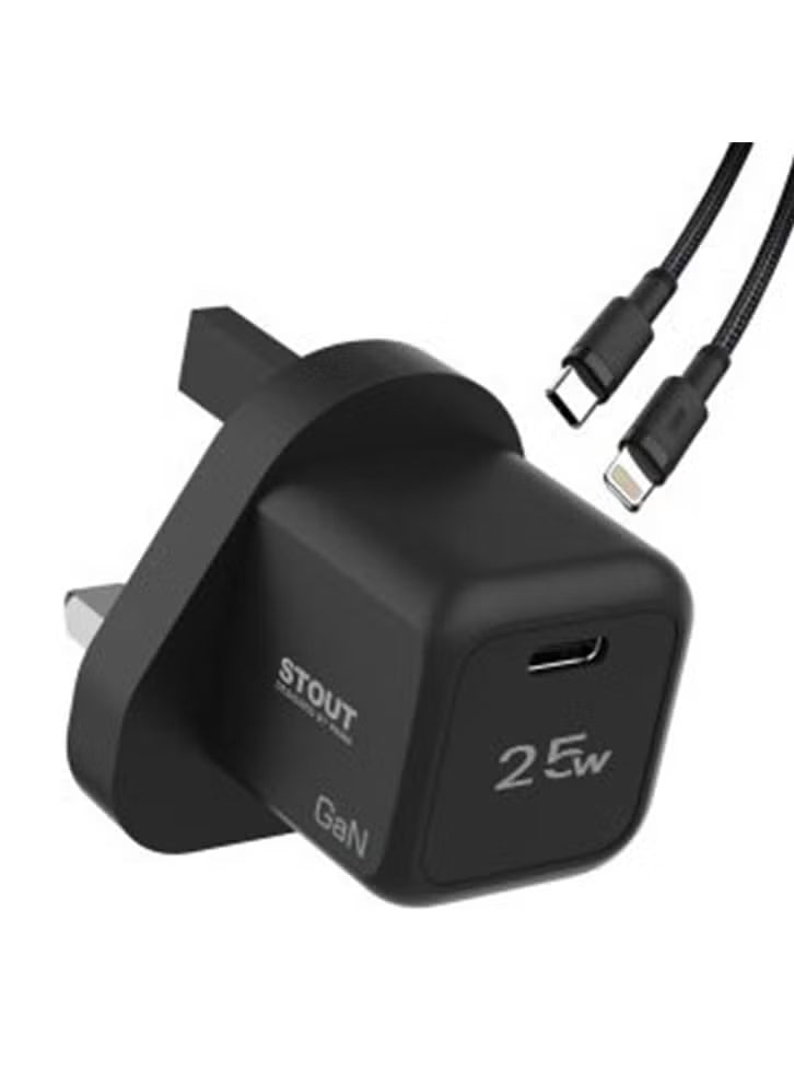 The Stout GaN Travel Charger with Single PD Port is a compact and efficient charging solution, designed for fast charging and maximum safety. Featuring a sleek black design, this 25W UK Standard charger includes a 1.2m Type-C to Lightning cable, perfect for charging your Apple devices. It supports a wide input range of 100-240V and outputs 5.0V/3.0A or 9.0V/2.77A, delivering up to 25W of power. The charger is equipped with advanced GaN technology and multiple safety protections, including surge, discharge, short circuit, low temperature, and fire protection, ensuring reliable and secure charging. Ideal for travel, the Stout GaN Travel Charger combines convenience, speed, and safety in a uniquely designed package.