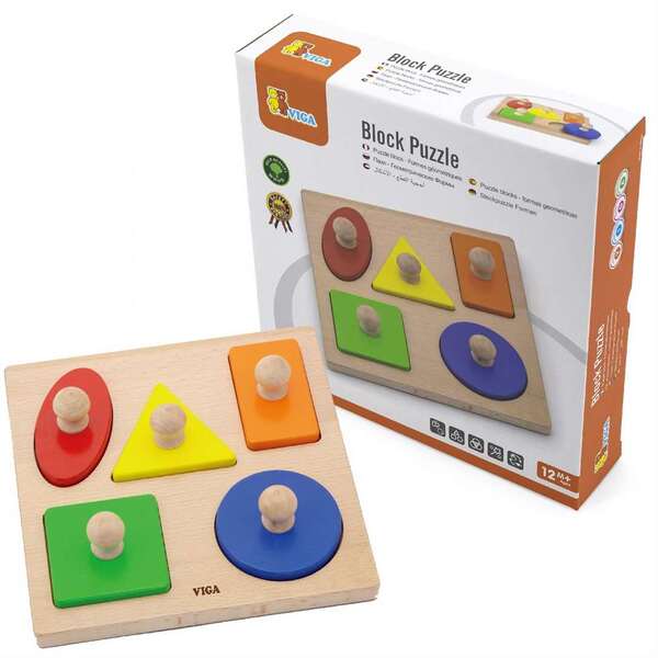 This is a solid block puzzle with a base made of high quality beech wood and strong wooden knobs. It also has extra large wooden knobs for little children to grasp easily. Matching animals and shapes.